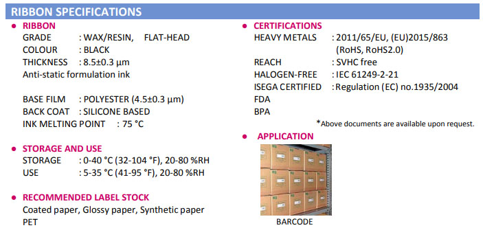 WR15 is a standard flat head wax/resin ribbon with an excellent scratch and smear resistance. It has a good transferability on to a wide variety of label stocks and can print using a low print head setting.